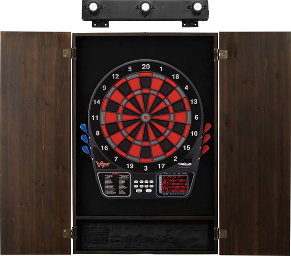 - Q: What is included in the Viper 797 Electronic Dartboard bundle? A: The bundle includes the Viper 797 electronic dartboard, a stylish metropolitan espresso cabinet, and a Shadowbuster dartboard light.