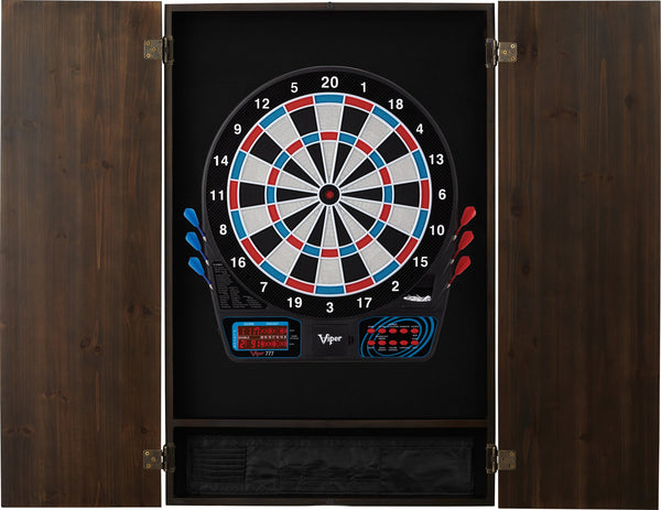 Everything you need to optimize your darting experience is now available in a convenient, comprehensive bundle. Choose either just the premium dartboard cabinet or a bundled set which contains the same dartboard cabinet and an electronic dartboard. Each cabinet includes mounting hardware. The Viper Metropolitan dartboard cabinet features a black felt lining and is available in 4 wood finishes (cinnamon, espresso, mahogany and oak). Crafted with solid pine, box joints and bronze hinges, this cabinets quality construction provides lasting durability and complements the look of any room. Its fitted with 2 compact door stoppers which help protect the dartboard and cabinet from a door slamming shut. Open dimensions: 49.5'' L x 38.5'' W x 3.5'' D; closed dimensions: 24.75'' L x 38.5'' W x 3.25'' D. Each electronic dartboard features a regulation 15.5'' target face and an ultra-thin spider which greatly reduces bounce outs and allows for a closer grouping of darts to maximize scoring. All bundles (with the exception of just the cabinet only and the standard bundle) include 1 set of Viper Black Magic 18 gram soft tip darts. These darts are designed with black coated brass barrels that deliver exceptional balance and styling. Strategically placed knurling and grooves provide excellent gripping points, enhancing your control. Each dart features an aluminum shaft featuring locking holes which deliver a tight connection that improves stability. The Elite bundle includes a Viper laser throw/toe line marker. The bright and energy efficient lighting of the laser allows it to be seen even in intense daylight. The adjustable laser throw/toe line provides a modern alternative to traditional adhesive floor markers. Once the laser is mounted, simply tighten the 2 screws on either side to ensure it stays in place, even if it is bumped.