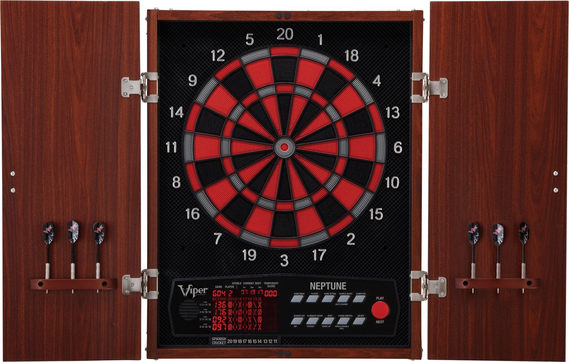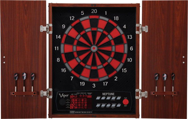 If YouRe Looking For A Complete Soft Tip Dartboard Set Up, Then Look No Further Than The Viper Neptune Electronic Dartboard. This 15.5 Regulation Electronic Dartboard Is Built Directly Into A Cabinet So You Have A Complete Setup Right Off The Bat. The Viper Neptune Has 57 Games, Including 01 And Cricket, As Well As Over 300 Scoring Options So You Can Play However You Want To. This Electronic Dartboard Also Supports Up To 16 Player Multiplayer So Everyone Can Join In On The Fun! The Backlit Lcd Display On This Dartboard Is Extended So You Can Play Specialty Games Like Minnesota And Spanish Cricket. This Soft Tip Dartboard Includes Six Starter Soft Tip Darts And Is Powered By The Included Ac Adapter.