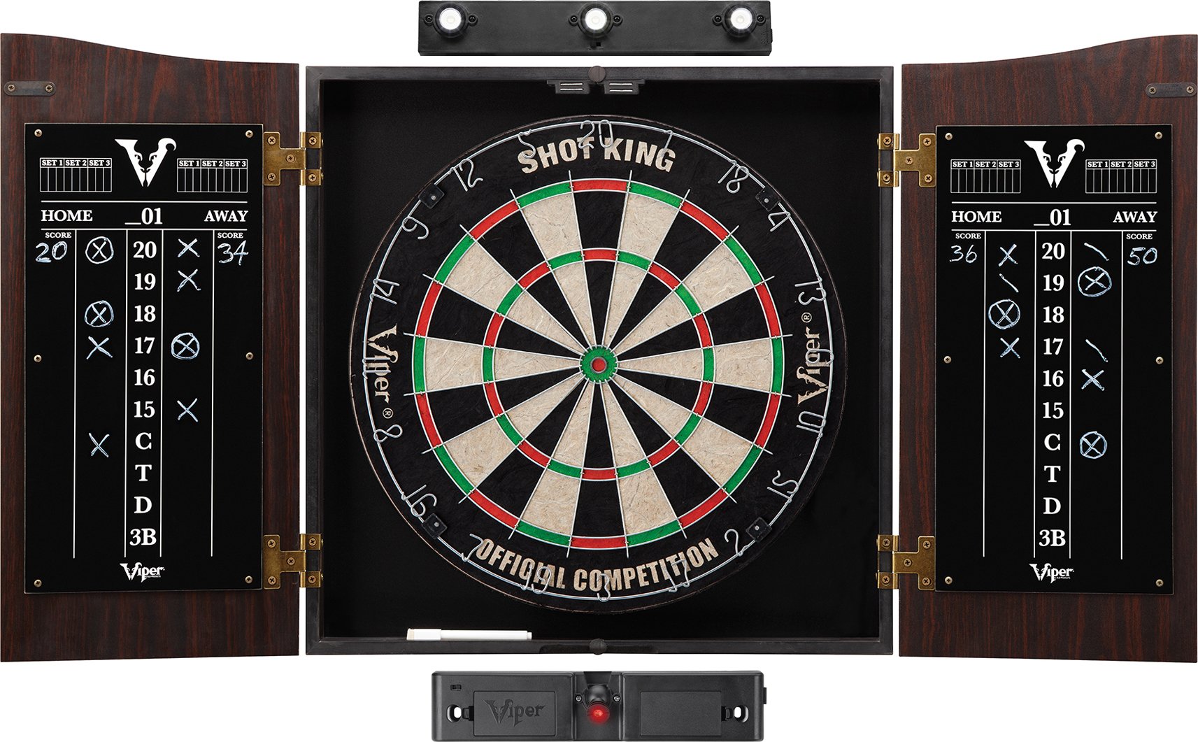 Everything you need to optimize your darting experience is now available in a convenient, comprehensive bundle Each Viper Vault bundled set contains a dartboard cabinet, a Viper Shot King sisalbristle staple-free bullseye dartboard, 2 complete sets of steel tip darts (6 total), a dry erase scoreboard, dry erase marker and mounting hardware The dartboard cabinet features a black felt lining and is fitted with 2 compact door stoppers, which helps protect the dartboard and cabinet from a door slamming shut Magnets keep the cabinet closed between games The quality construction provides lasting durability and complements the look of any room Open dimensions: 42 L x 215 W x 3 D closed dimensions: 21 L x 215 W x 3 D Measuring 18 in diameter and 15 D, which is official tournament size, the Viper Shot King dartboard features a staple-free bullseye which greatly reduces bounce outs Its constructed from sisalbristle fibers compressed together, providing unsurpassed durability A movable number ring further extends the dartboards life The steel tip darts are designed with high quality, nickel silver plated barrels, which offer exceptional balance and styling in a slim profile Strategically placed knurling and grooves provide excellent gripping points, enhancing your control choose from the Standard, Deluxe, Premium and Elite sets, selecting the bundle that suits your needs The Standard bundle includes a Viper Edge dart throwtoe line marker The Deluxe bundle includes a Viper laser throwtoe line marker The Premium bundle includes a Viper Edge dart throwtoe line marker and a Viper Shadow Buster cabinet mounted display light The Elite bundle includes a Viper laser throwtoe line marker and a Viper Shadow Buster cabinet mounted display light cOMPONENTS: The Viper Edge dart throwtoe line marker is constructed with high quality printing and heavy duty resin to withstand heavy foot-traffic areas The Viper laser throwtoe line marker delivers a bright and energy efficient laser beam which allows it to be seen even in intense daylight The adjustable laser throwtoe line provides a modern alternative to traditional adhesive floor markers Once the laser is mounted, simply tighten the 2 screws on either side to ensure it stays in place, even if it is bumped The Viper Shadow Buster cabinet mounted display light illuminates your dartboard, enhancing your visibility and transforming your game room into a true centerpiece It features 3 adjustable bright and energy efficient LED light pods, delivering a crisp, clear view at any distance