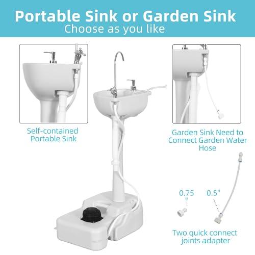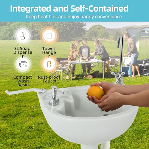Dual Use Portable Sink: This portable sink can be self-contained with foot pump for camping, and also can be connected to a garden hose for continuous water with the faucet knob to control | Generous Water and Soap Capacity: Equipped with a 17L fresh water tank and a 3L liquid soap container, this hand washing station delivers up to 90 uses and over 3000 soap applications, ensuring you stay fresh and clean through all your outdoor activities | Convenient Foot-Pump Operation: Step on the foot pump to release a steady 0.2L stream of water effortlessly. This feature saves water and ensures quick cleanup - easy for messy hands during playtime, BBQs, or outdoor adventures | Thoughtful Accessories for Convenience: Our wash basin stand includes a foldable rod for towels and paper roll, and built-in wheels with an easy-to-grip handle for effortless mobility. Every detail is designed to simplify your outdoor experience | Versatile And Seamless Setup: Impeccable for gardens, campsites, RVs, boats, or construction zones, and ideal for the elderly or patients needing easy cleaning. Its lightweight design and no-tool assembly let you set up in minutes, ready for any washing need