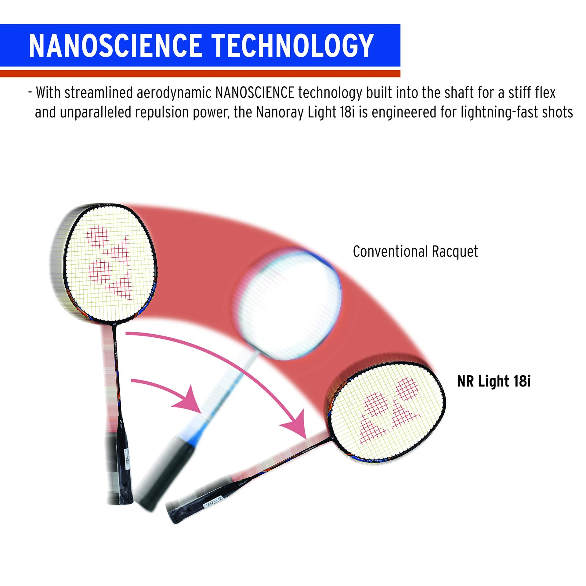 NANOSCIENCE technology - With streamlined aerodynamic NANOSCIENCE technology built into the shaft for a stiff flex and unparalleled repulsion power, the NANORAY 68 Light is engineered for lightning-fast shots Ultra-light (77 grams) - Speedy shots & great maneuverability without sacrificing on power | High tension support (30 lbs string tension) - more power and better control. Head Size: 6.5 sq. in.