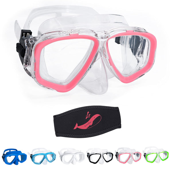 Premium Scuba Diving Swimming Snorkeling Mask Our silicone is soft, comfortable and perfect for your next underwater expedition The OMgear Kids swim mask comes with a 90-Day refund guarantee and a one year manufacturers warrantyBest quality materials Our swimming goggles are made by highly durable materials food grade silicone strap and skirt, tempered glass lens ,softy neoprene strap cover, providing extremely comfortable performanceFeatures Diving mask ( Pc frame) - water-tight ,100% leak-free - Tempered glass Lens, durable and safety even when deep diving - Easy-Adjustable side buckles and silicone strap (one size fits all ) -180APanoramic wide view, providing perfect underwater adventure-Enhanced comfort (silicone strap and skirt, neoprene band) Important advice -Do not jump into water while wearing this -When initial use, you can rub toothpaste on the inside of both lens with your finger for around 5 minutes, then wash with water This will be helpful for preventing lenses fogging After using every time, washing with fresh water can prolong life of your OMgear swim goggles with nose cover